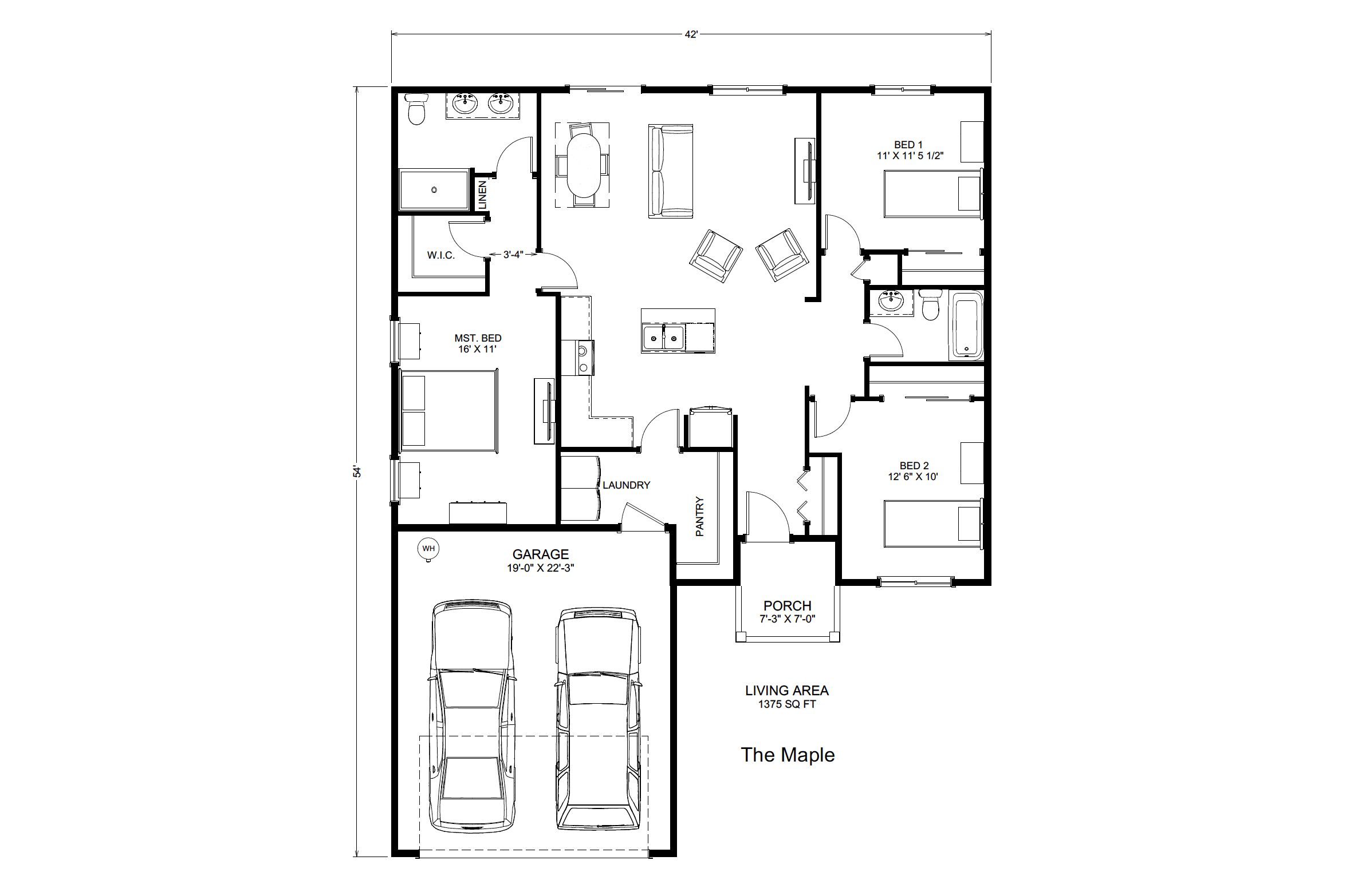 Split-bedroom design in this 3 BR 2 BA rambler with 2-car garage. Generous secondary bedrooms and great room layout.
